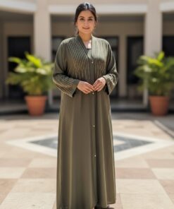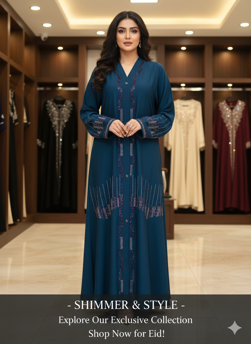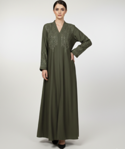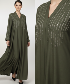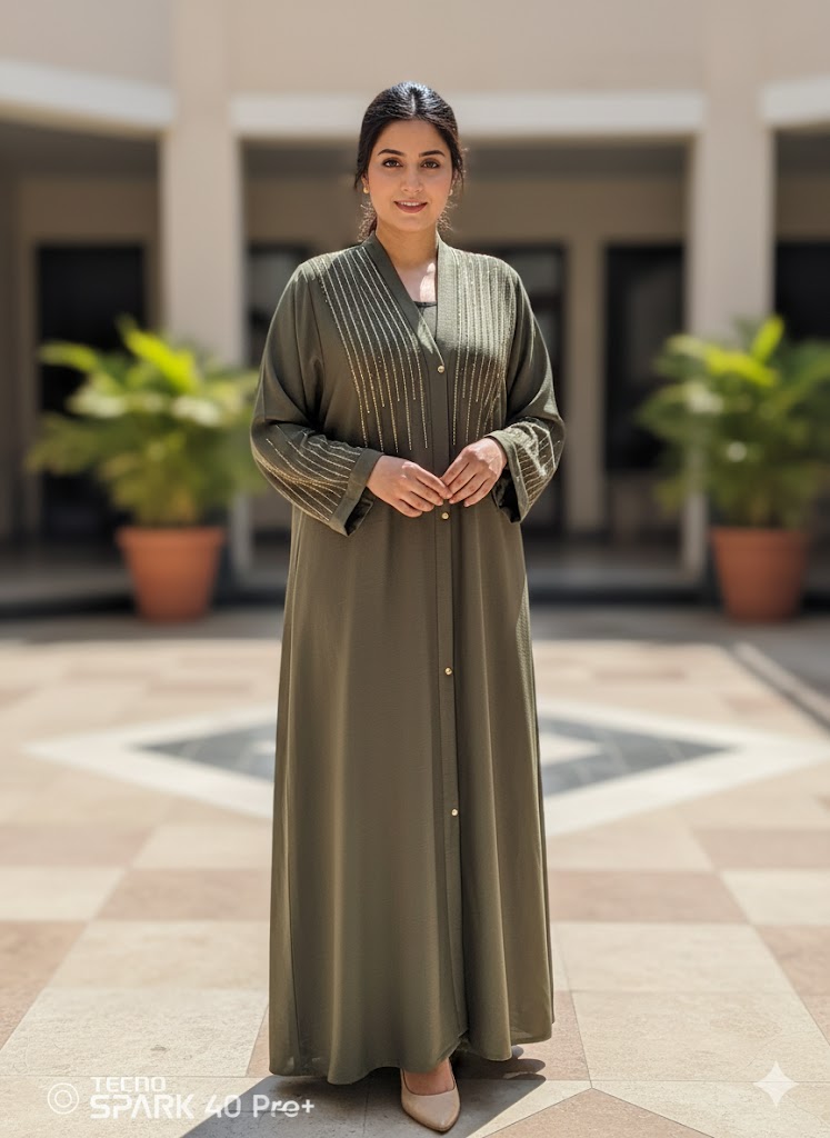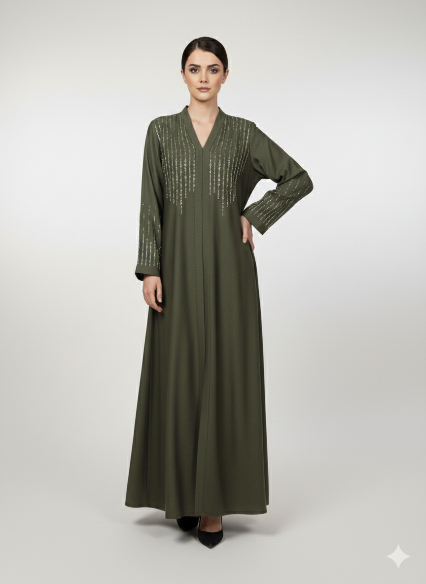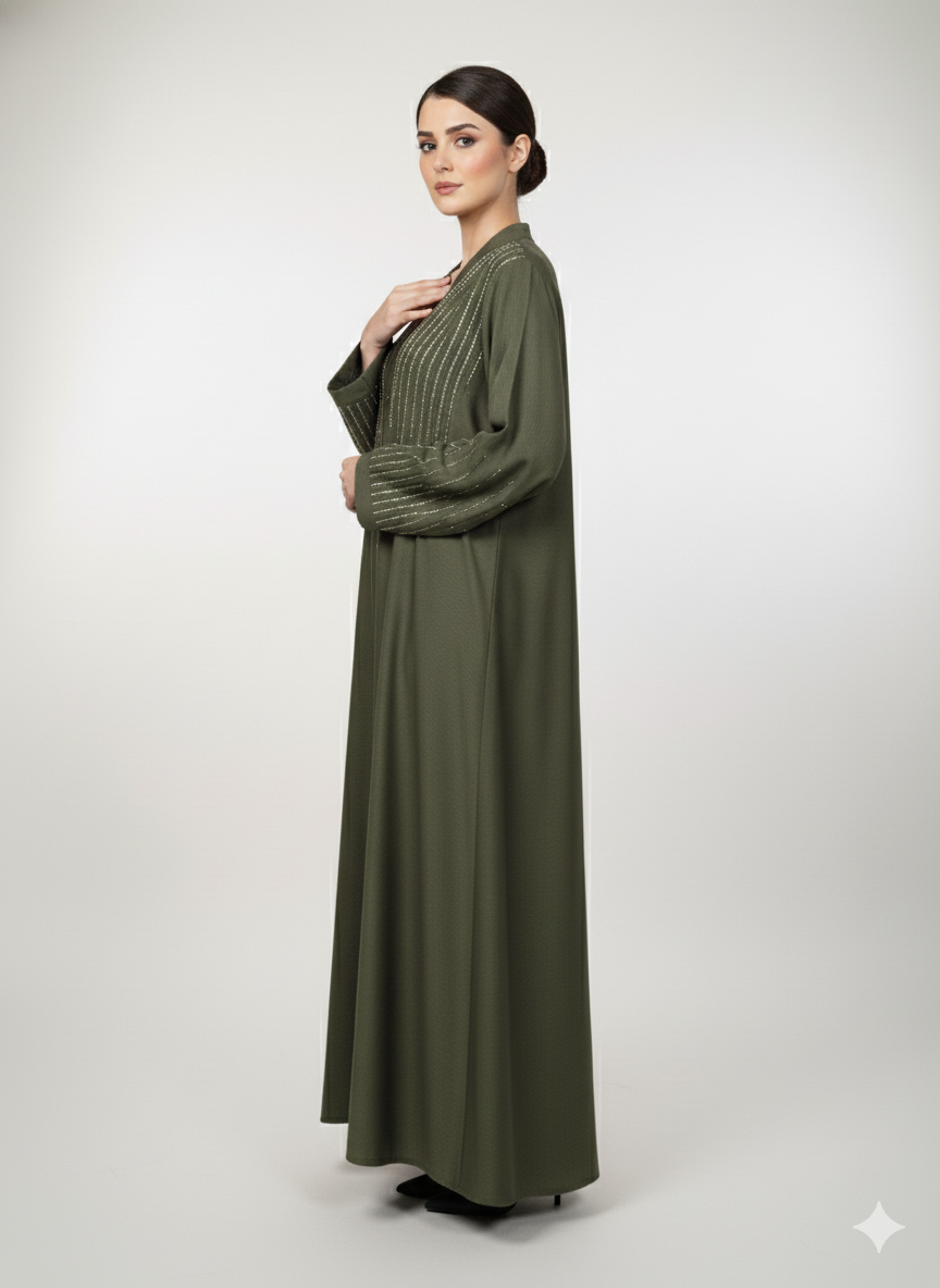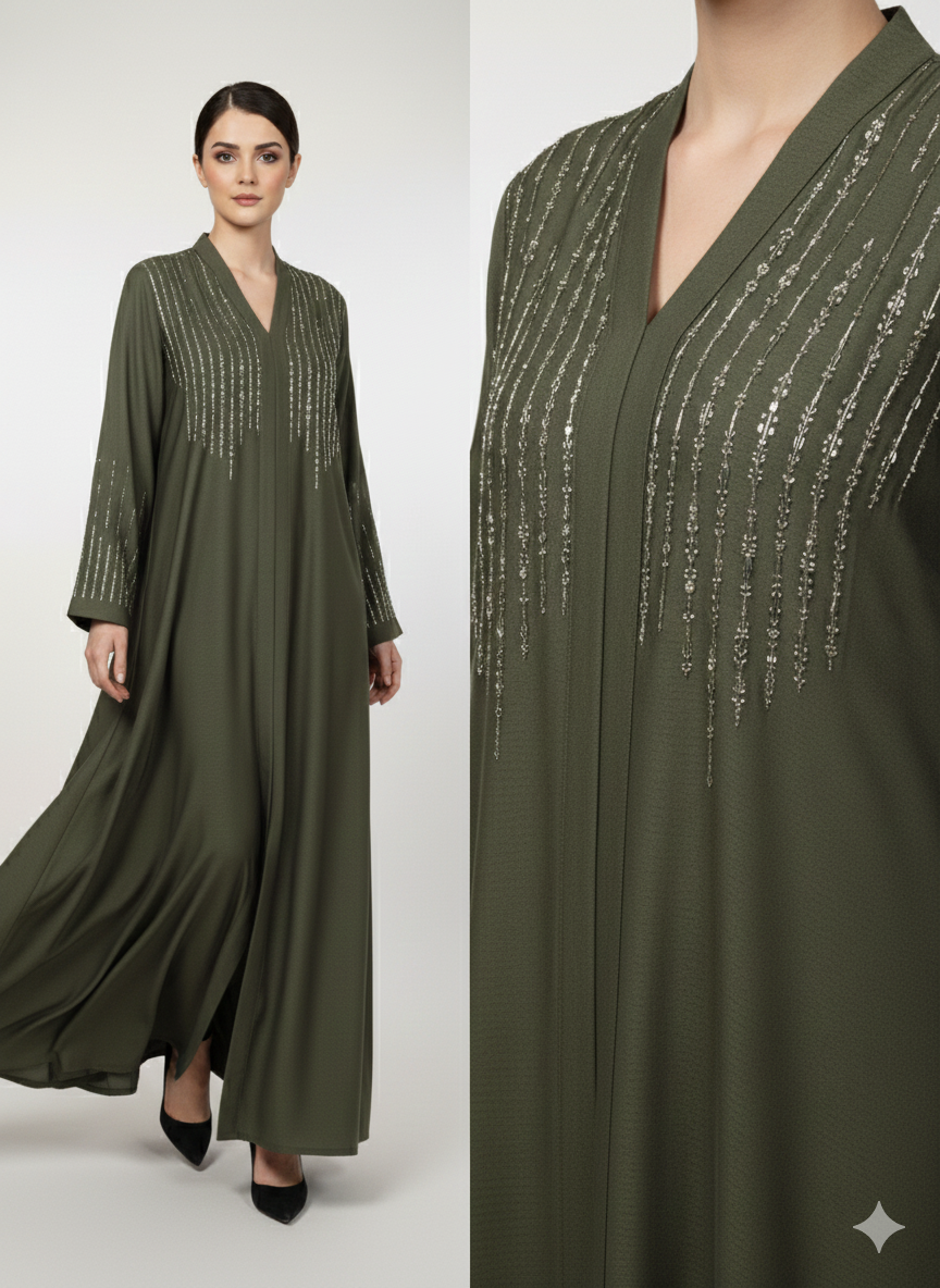Description: Experience luxury with our latest arrival. Crafted from the finest TikTok fabric, this abaya features intricate vertical DMC stone lines that add a slimming effect and a touch of sparkle. The wide sleeves are adorned with matching hand-embroidery, making it a standout piece for any occasion.